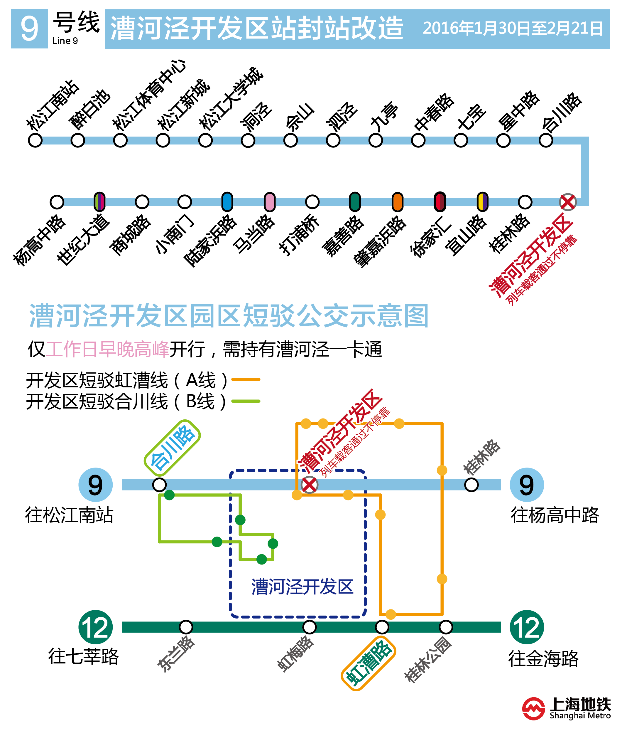 1、2016年1月30日至2月21日期间,9号线漕河泾开发区站封站“跳停”,其他车站正常运营。