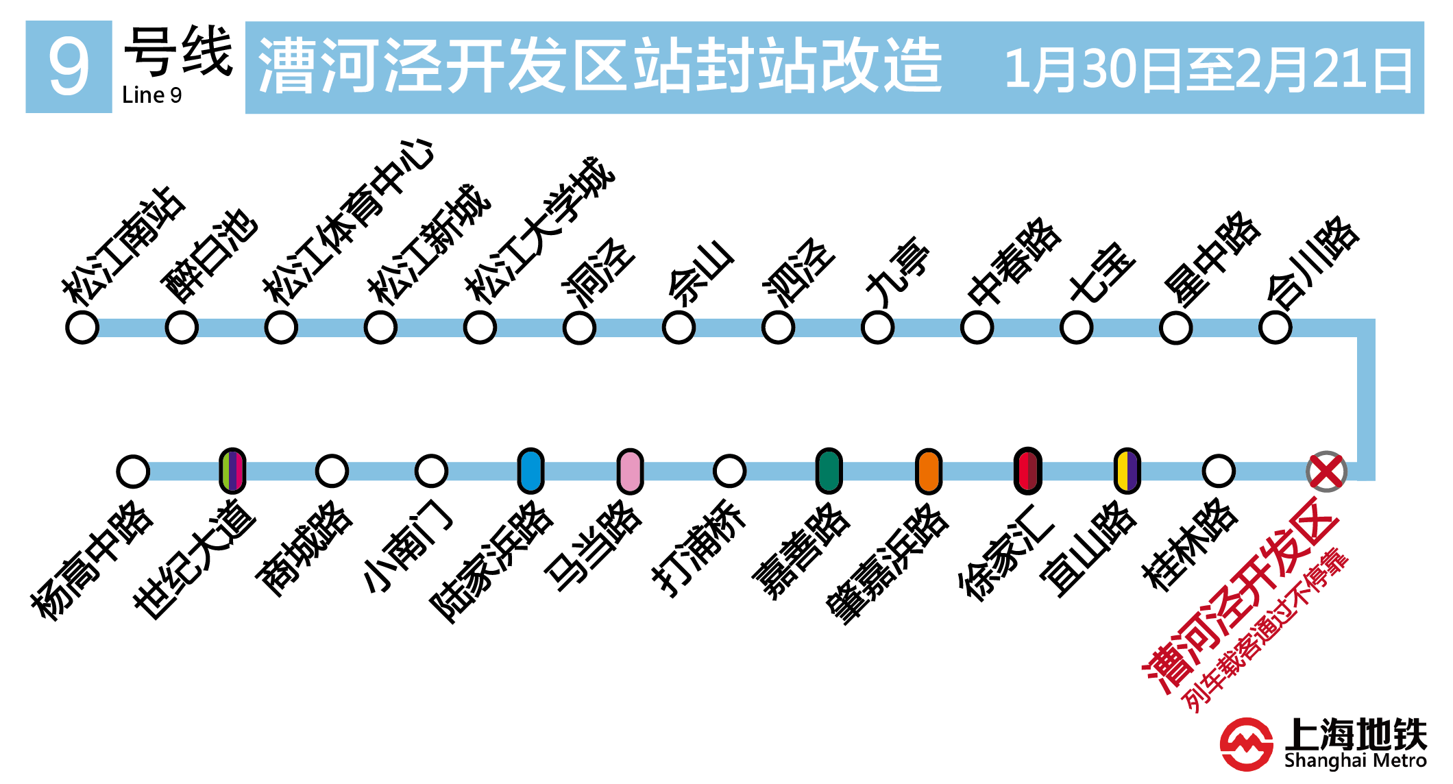 1、2016年1月30日至2月21日期间,9号线漕河泾开发区站封站“跳停”,其他车站正常运营。