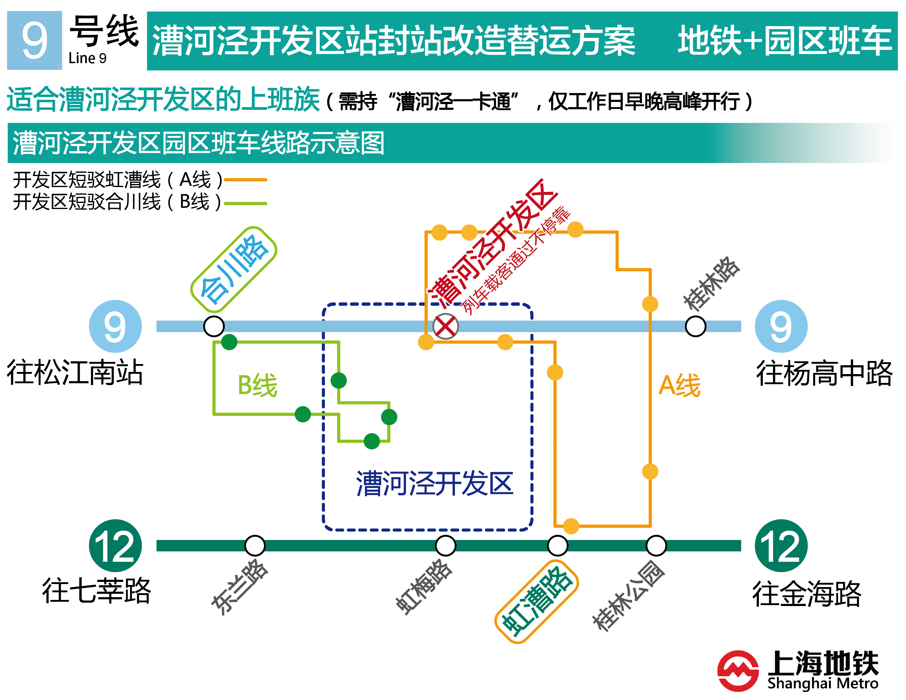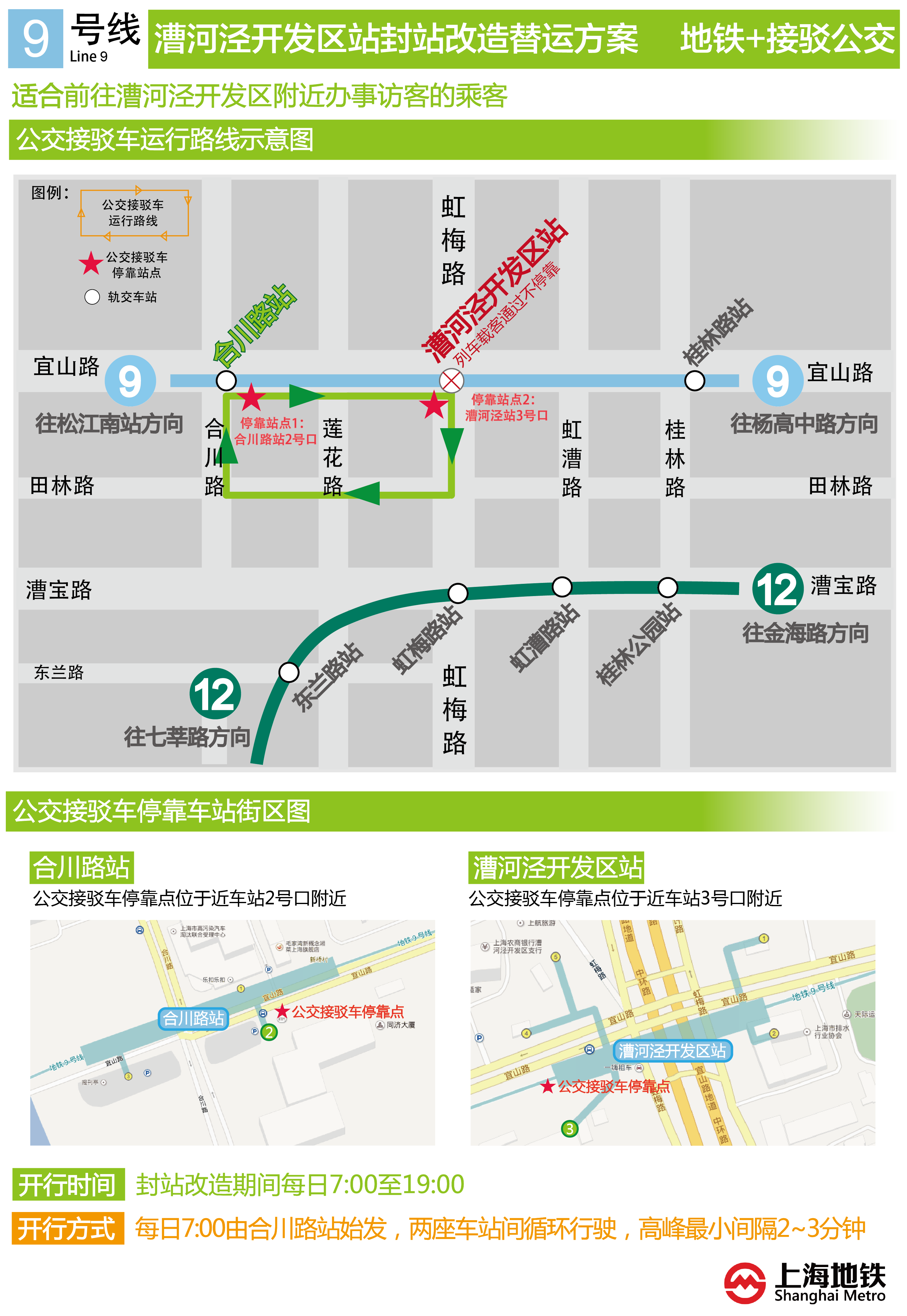 临时封站改造期间,开设合川路站至漕河泾开发区站“9号线接驳线路(合川路-漕河泾开发区站)”,沿合川路、宜山路、进虹梅路枢纽,回程沿虹梅路、田林路到合川路。9号线接驳线路运营时间为合川路站7:00-19:00,漕河泾开发区站7:20-19:20。工作日早晚高峰时段间隔约为2-3分钟,其余时段及节假日间隔约10-15分钟。(受地面交通的影响,具体间隔以实际为准)