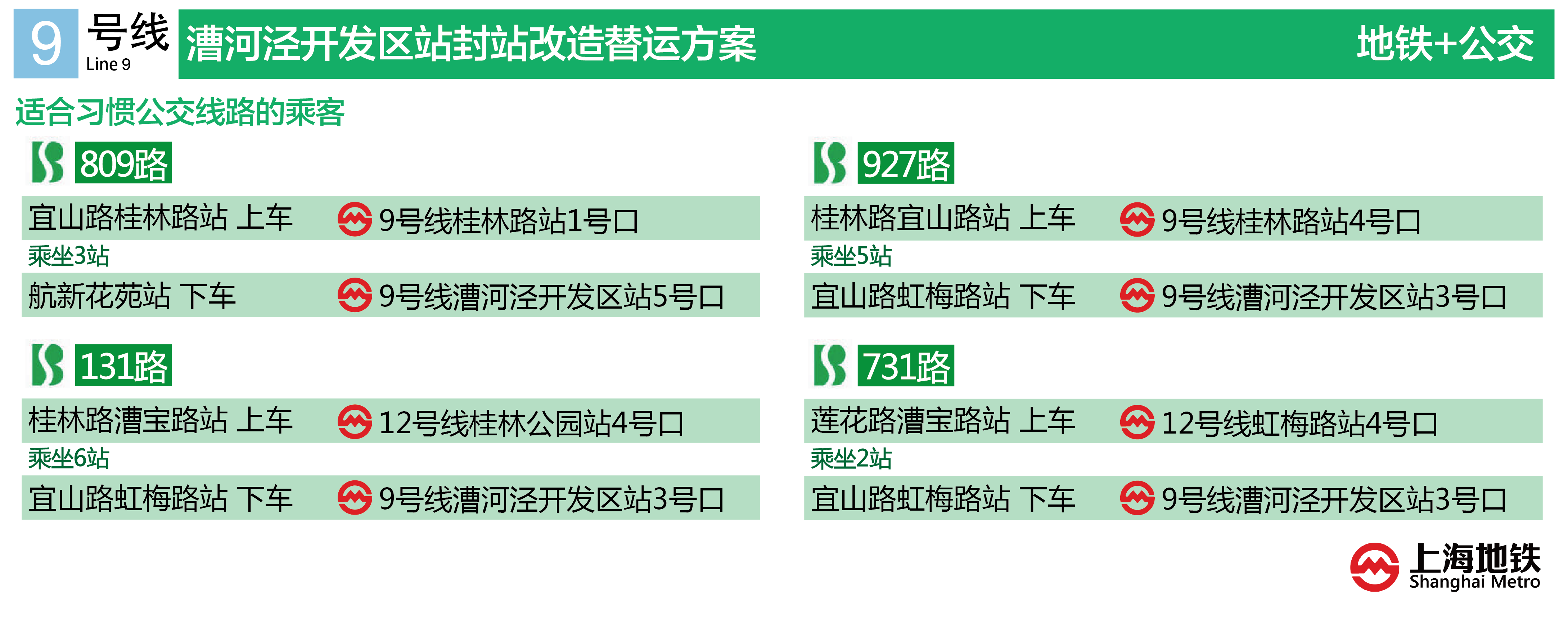 临时封站改造期间,前往9号线漕河泾开发区站的乘客可至9号线桂林路站换乘地面公交809路、927路,也可乘坐公交131、731、89、205、92、257等公交线路,到达漕河泾开发区周边。