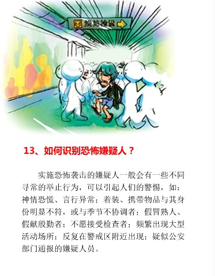 实施恐怖袭击的嫌疑人一般会有一些不同寻常的举止行为,可以引起人们的警惕。如:神情恐慌、言行异常;着装、携带物品与其身份明显不符,或与季节不协调者;假冒熟人、假献殷勤着;不愿接受检查者;频繁出现大型活动场所;反复在警戒区域附近出现;疑似公安部门通报的嫌疑人员。