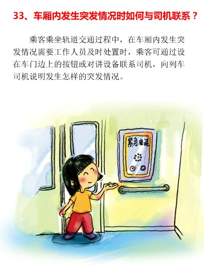乘客乘坐轨道交通过程中,在车厢内发生突发情况需要工作人员及时处置时,乘客可以通过设在车门边上的按钮或对讲机设备联系司机,向列车司机说明发生怎样的突发情况。